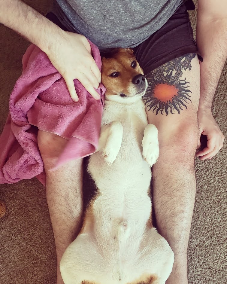 Bear is known for his awful smelling breath and loving nature. He gives the best boops. Logan says he is “un-athletic”, which is true. He has short legs and is not very fast. He’s got chubby toes that we call “toe beaners”; they are very cute and he licks them often. He also snores very loud and gets grumpy when you wake him up or move him. He typically lays in a splooted position. We don’t know why, but he looks comfortable. Lastly, he always raises his leg (“his turkey”) for you to pet when you get close to him.
