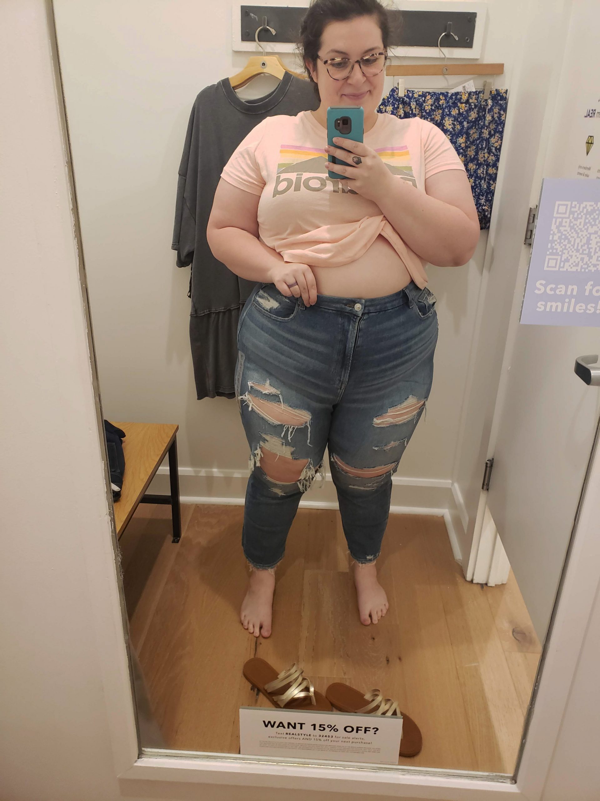 There weren’t many options at my location with minimal distressing, but these seemed to be more my style. I tried them on once again in the biggest size, a 20. However, they were tight in the leg and would not button at the waist. Also, the distressing on the ankle was hard to get on. I stepped into the jeans and the distressing got all kinds of stuck on my foot. And there’s my underwear and stretch marks.