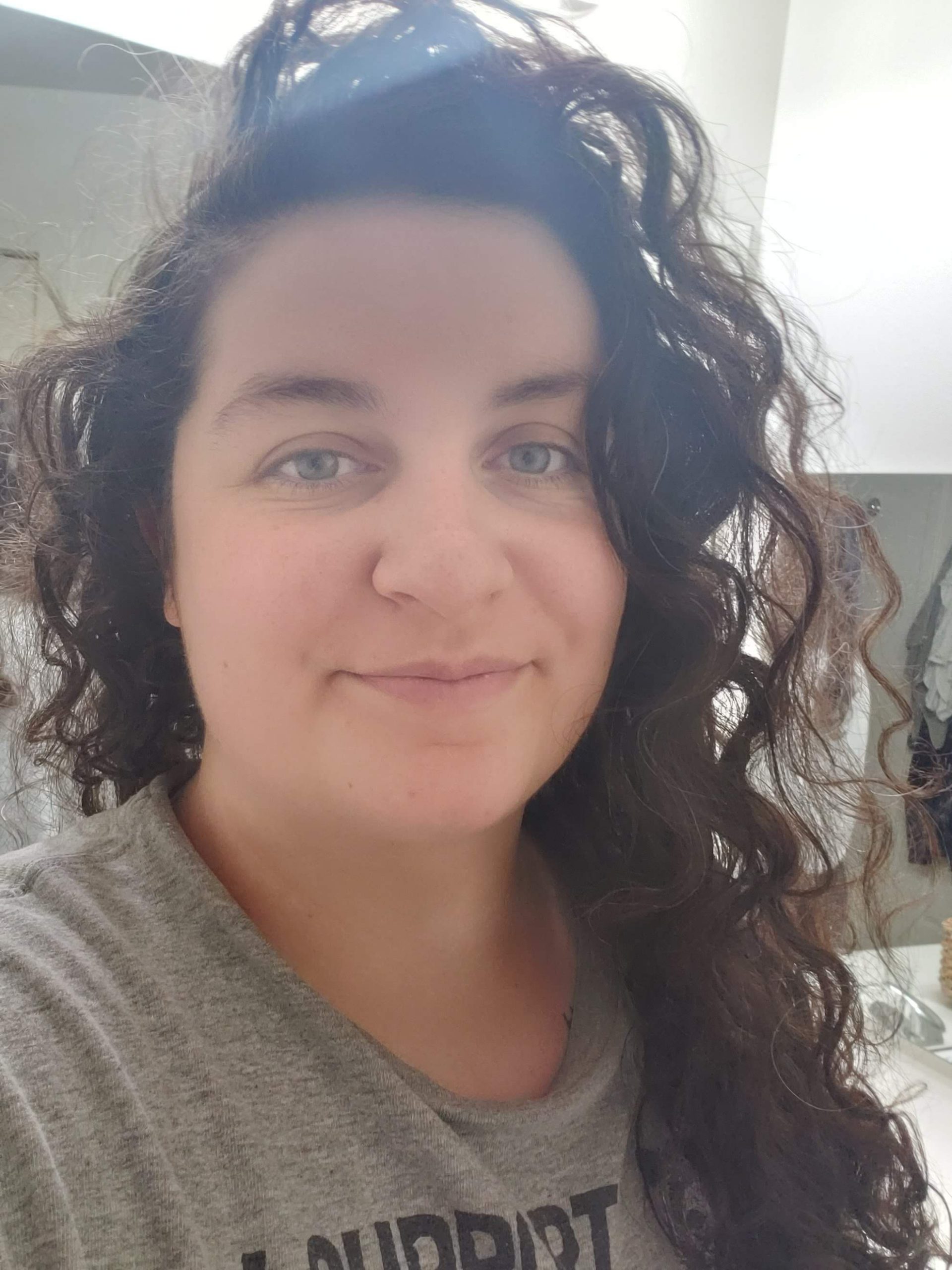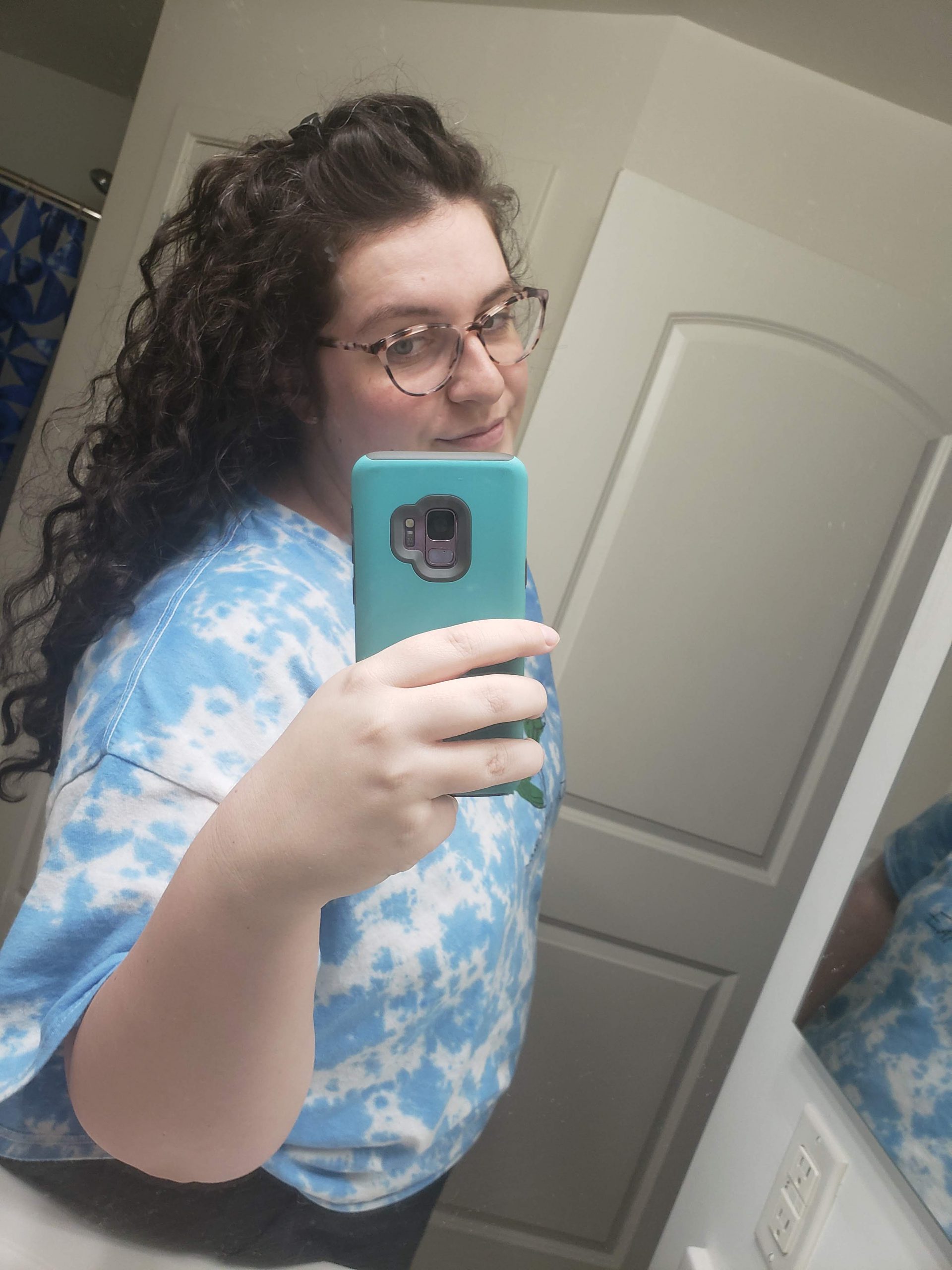 I dry my hair in a towel for awhile and then brush through my hair when it is almost dry. I then apply curling cream; my holy grail curling cream is the Curl & Style Milk from Shea Moisture. I apply that cream throughout my hair, then I scrunch my hair to set the curls in place. Then, I attempt to plop my hair. I’m not good at this, so it usually ends up twisted in a t-shirt. I try to let my hair dry in the t-shirt for as long as possible when I do this method.