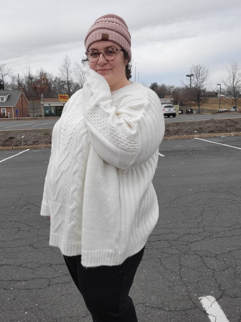 For the most comfortable, cozy look, I paired those pants with an oversized white sweater that I asked for and received for Christmas. I wanted it big and oversized so that I could wear it with leggings and as a dress. Mission accomplished.